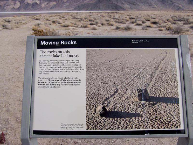 The National Park Service writes on the placard above that people other than scientists have suggested that floating rafts of ice are responsible for moving large rocks around on the playa.  My question is, can the Racetrack's rocks move in any OTHER way?